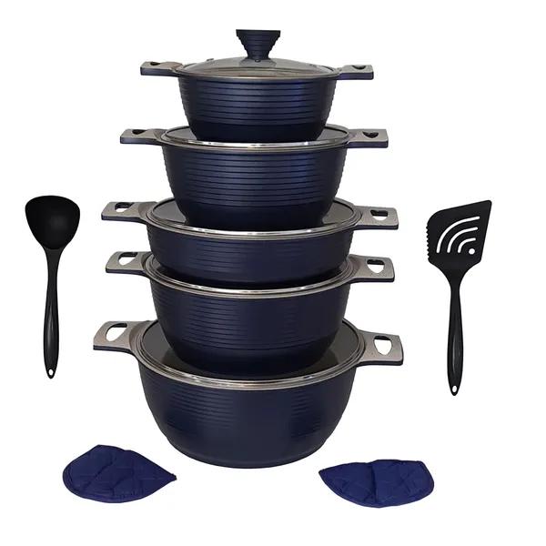- سرویس قابلمه ۱۴ پارچه گرانیتی ویکند Weekend مدل New Flower متشکل از: ۴ قابلمه دو دستگیره به سایزهای ۲۰ و ۲۴ و ۲۸ و ۳۲ سانتیمتر ۱ تابه دو دستگیره به سایز ۲۸ سانتیمتر دارای سرویس کفگیر، ملاقه و دستگیره