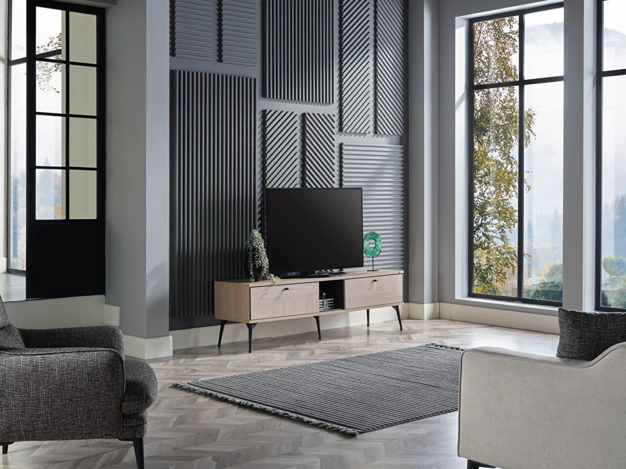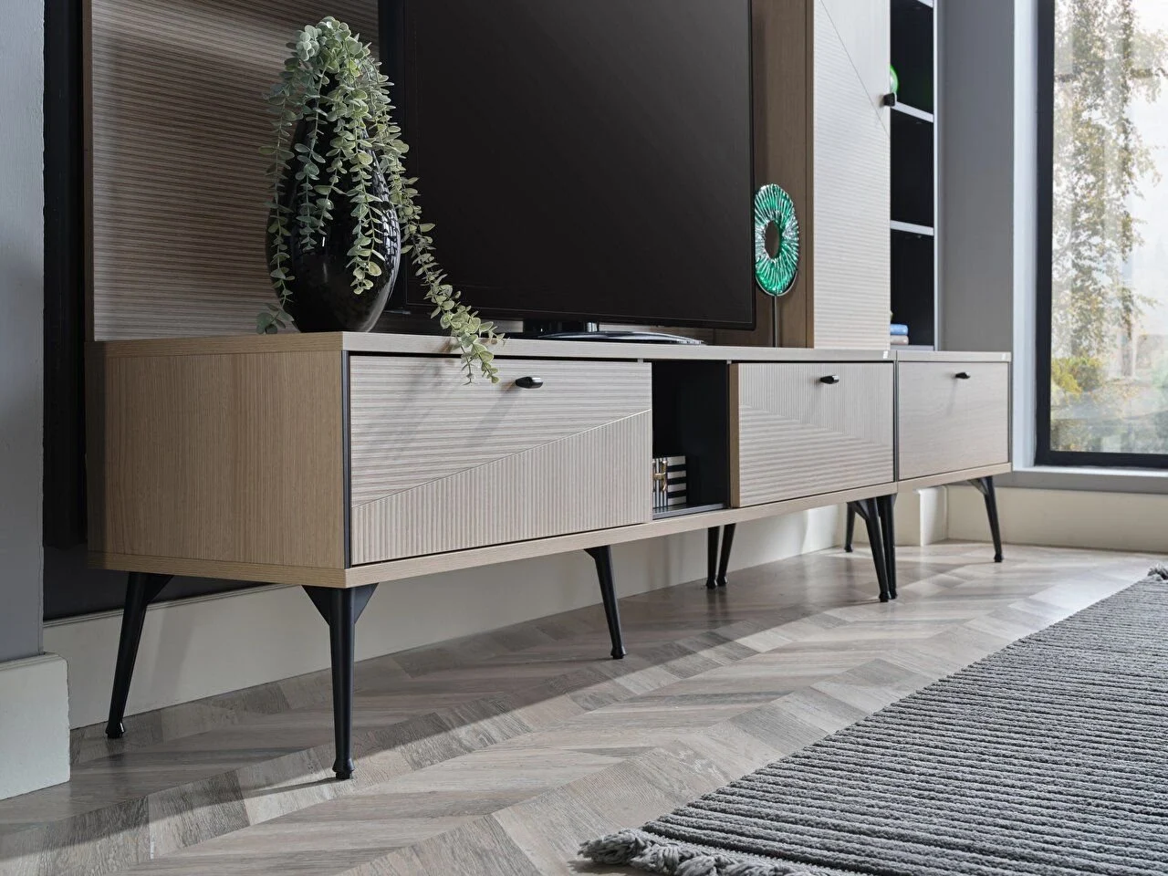 میز تلویزیون مدل فرشته طراحی جذاب و به روزی داره و به سادگی با انواع دکوراسیون مدرن و حتی نیمه کلاسیک ست میشه. این محصول دارای یک عدد میز، بخش شلف و باکس جانبی است.